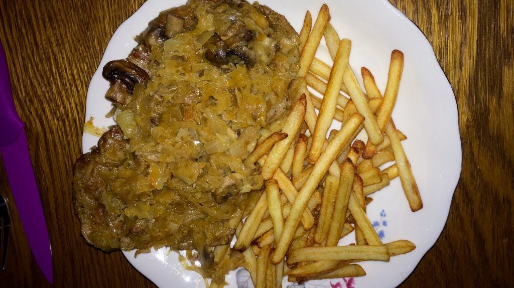 Na kapustę wyłożyć podsmażone plastry karkówki, między, każdy plaster karkówki włożyć pokrojone pieczarki i cebule , resztę wysypać na wierzch karkówki i oprószyć przyprawami (papryka, czosnek )Naczynie zakryć pokrywką i wstawić do piekarnika piec 45 minut w 180 stopniach.
